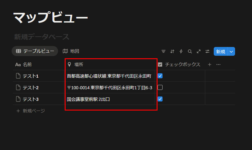 この「場所」プロパティを持っていないデータ(ページ)はマップビューでは表示できません。