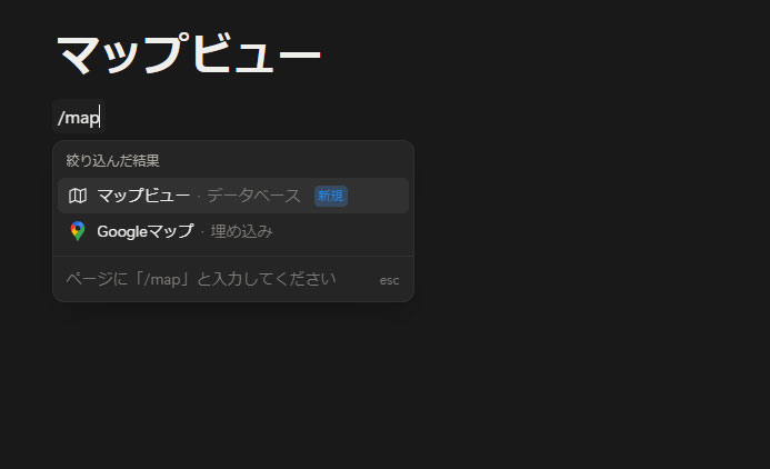 最も簡単な方法はページ内に「/map」と入力して表示された「マップビュー」の項目を選択する方法です。