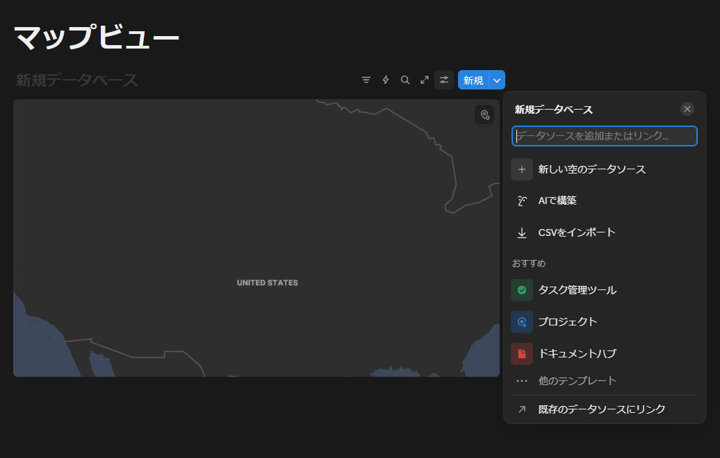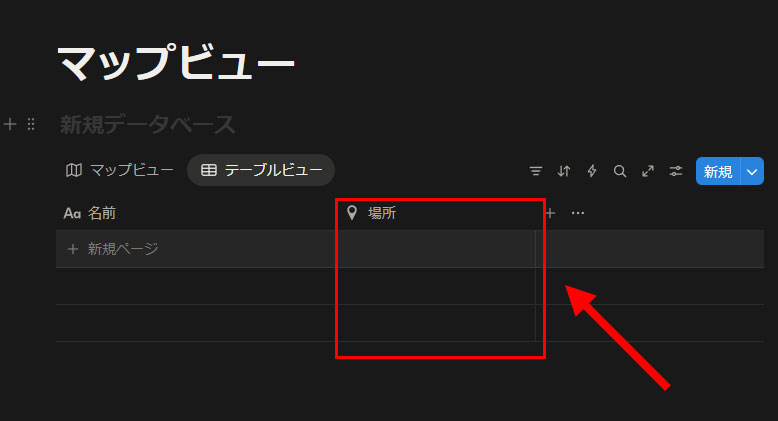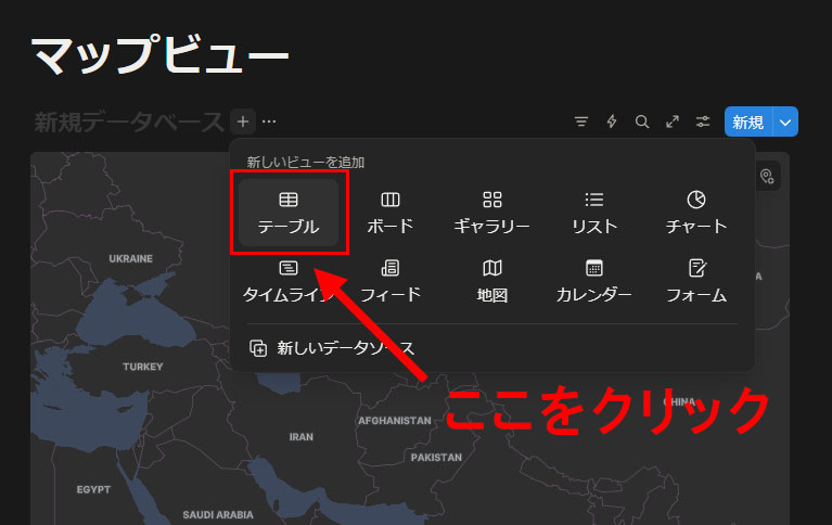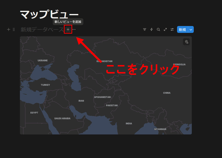 「/map」入力で作られたデータベースにはマップビューしかないので、データの入力方法が分かりづらいと思います。そのため、一度、「テーブル」ビューを追加します。マップビューの上にあるぷ「新しいビューを追加」をクリックします。