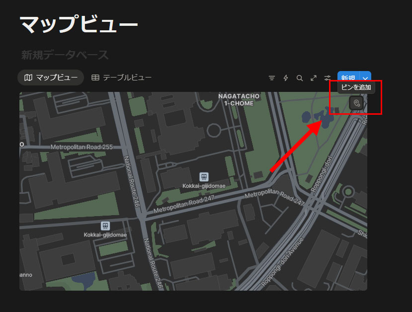 マップビューからデータを入力したい場合は、マップの右上にある「ピンを追加」というアイコンをクリックします。