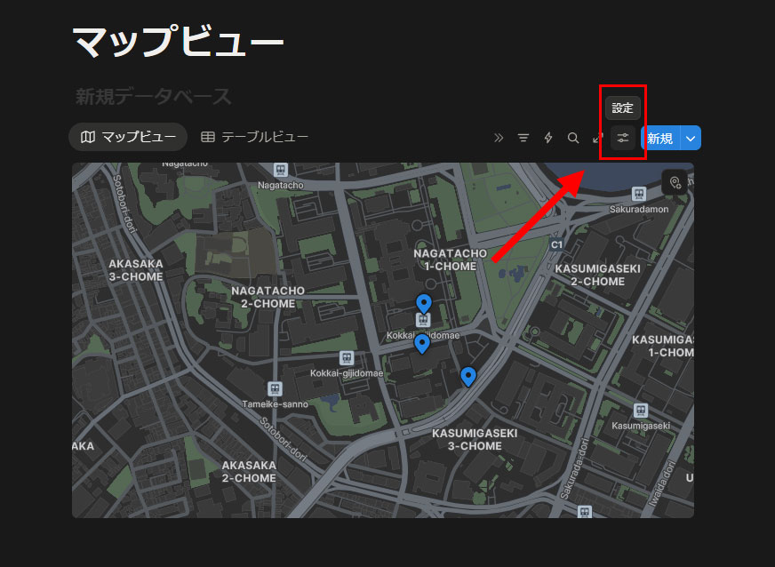 マップビューの設定について見ていきます。マップビューを表示した状態で右上辺りにある「新規」ボタンの左隣に設定アイコンがあります。
