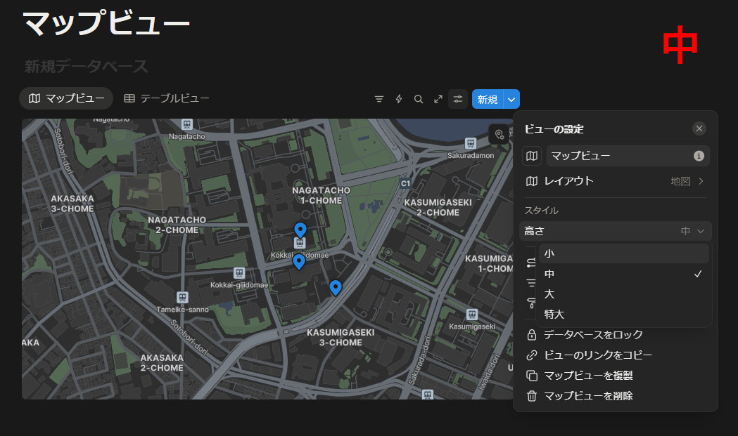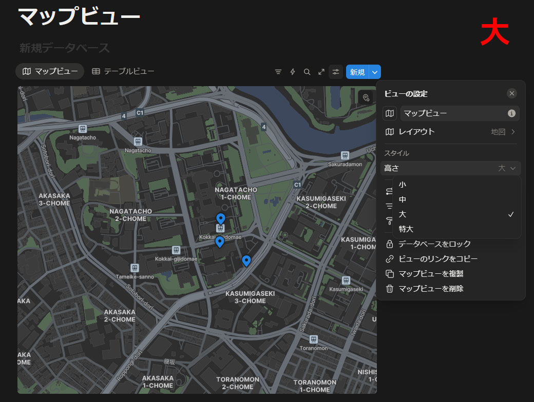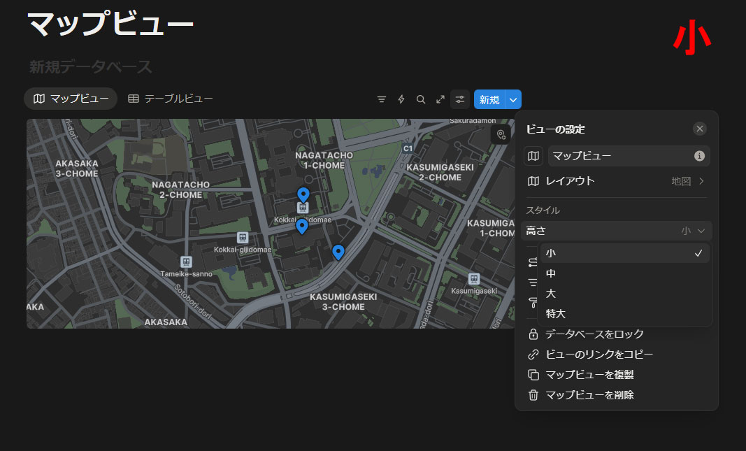 マップビューの設定項目はそこまで多くありません。まずは「スタイル」で表示するマップの高さを変えられます。小、中、大、特大の4段階です。