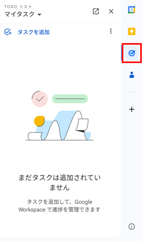 GmailやGoogleカレンダーの画面右側には、各種ツールを開くためのサイドバーが表示されています。ここからGoogle ToDoリストを起動できます。