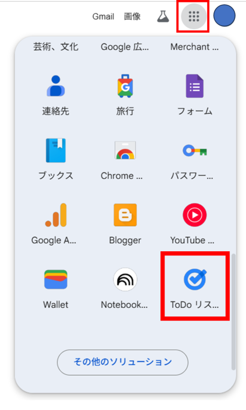 Google検索エンジンやGoogleスプレッドシートなど、サイドバーが表示されていない画面でも、Googleのツール一覧からGoogle ToDoリストを開くことができます。