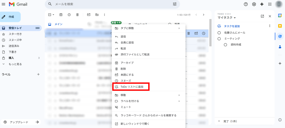 Gmailでは、届いたメール上で右クリックすると「ToDoリストに追加する」という項目が出てきます。ここからメールそのものをリストに追加することが可能です。