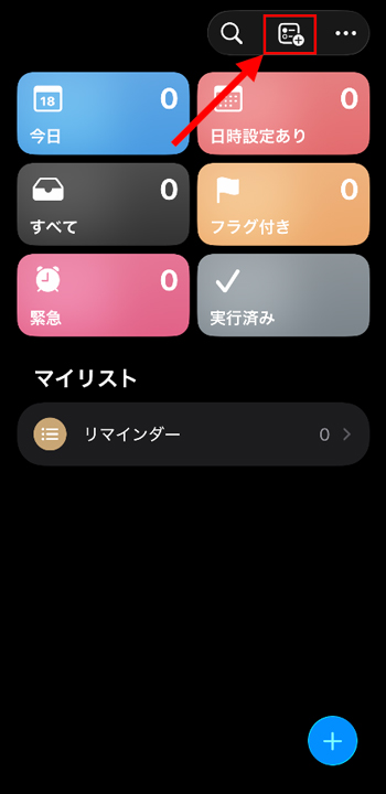 リマインダーアプリの最初の画面の右上に並ぶアイコンの真ん中(下記)をタップします。