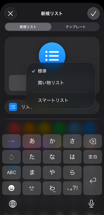 作成画面が開くので、新規リストにリスト名を入力し、色やアイコンなどを決めます。リストタイプという項目がありますが、ここでは標準を選びます。