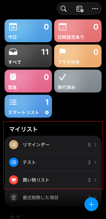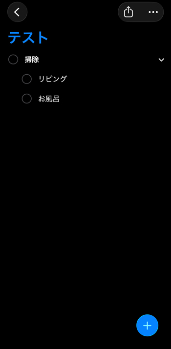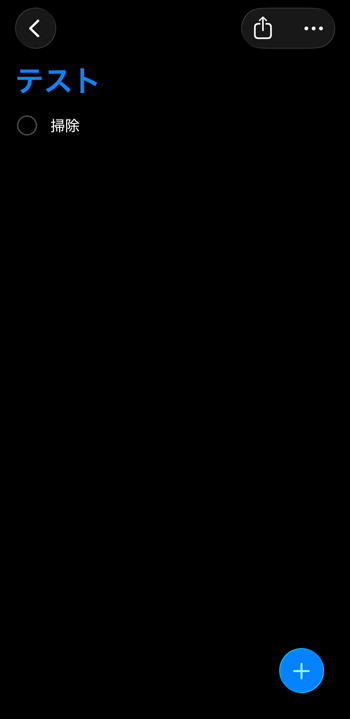 リマインダーはマイリストの中の空いているスペースをタップすることでも作成できます。下記は「テスト」という名前のマイリストの中身です。