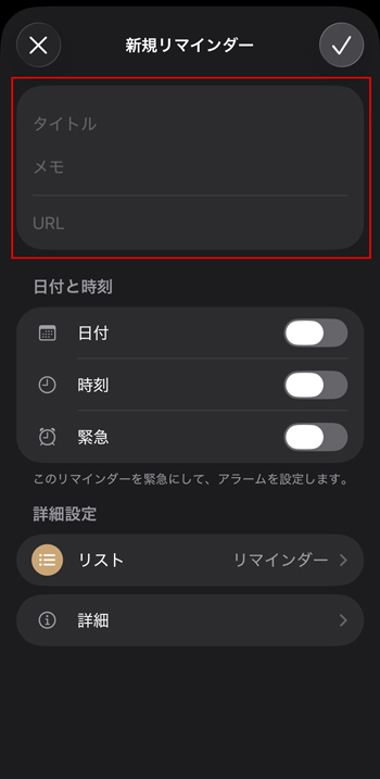 タイトルとメモの項目にはリマインドする内容を記入します。WEBページなどを紐づけたい場合はURLを入れておきましょう。