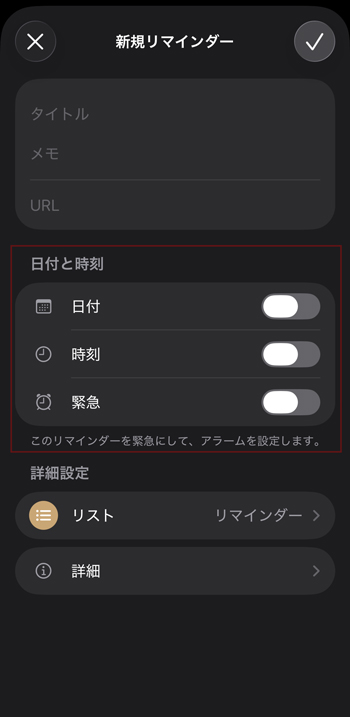 日付と時刻にはリマインドする日時を設定します。緊急の項目をオンにすると設定した日時にアラームが鳴ります。