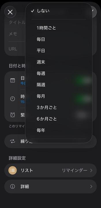 毎日や毎週など、定期的にリマインドしたい場合は「繰り返し」項目で設定します。
