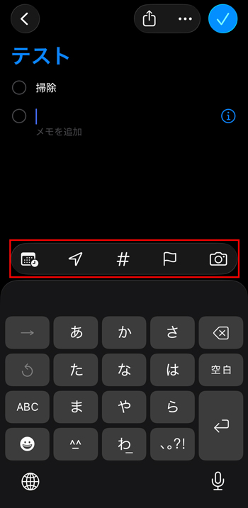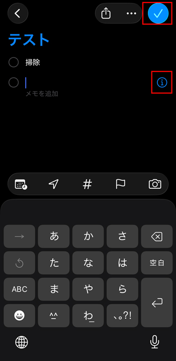 リマインダーの右端の「i」のアイコンをタップすると、さらに詳細な設定を行うことができます。作成完了は右上のチェックアイコンをタップします。