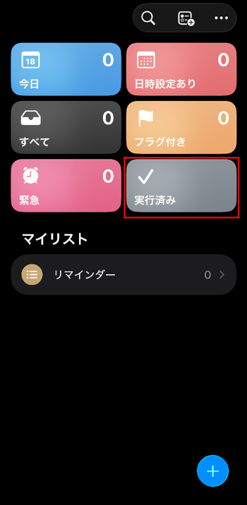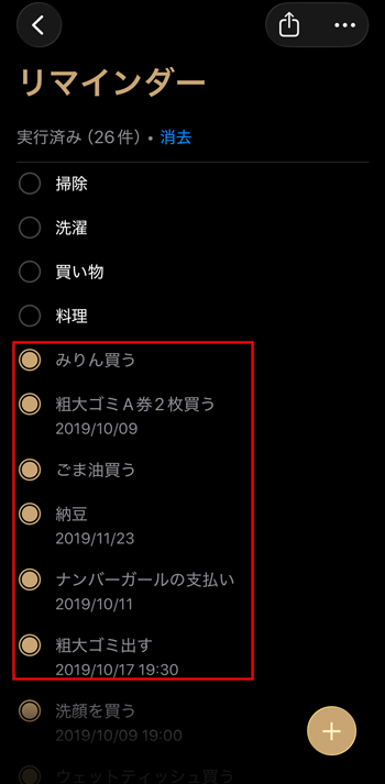 タスクを完了したら、リマインダーにチェックを入れるとリストからは消えます。完了したリマインダーは「実行済み」というスマートリストで確認することができます。