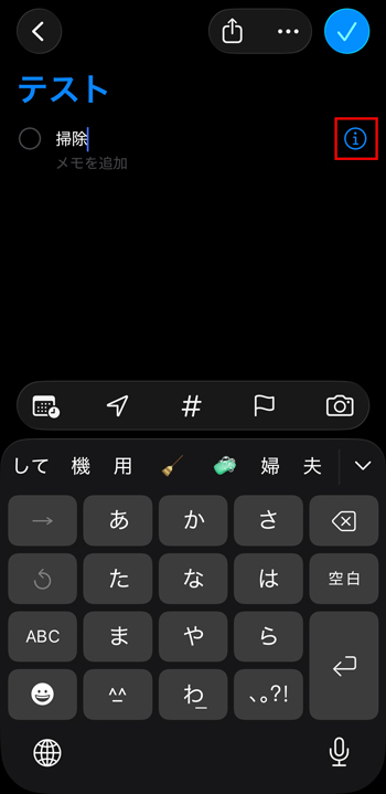 サブタスク機能を使って、タスク(リマインダー)の中に子タスクを作ることができます。例えば、「掃除」というタスク(リマインダー)の中に子タスクとして「リビング」「お風呂」など具体的な対象を作成するイメージです。「掃除」のリマインダーの右端の「i」アイコンをタップします。