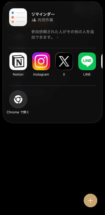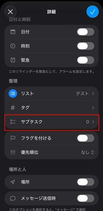 リマインダーを作成するには右下の+アイコンをタップして、各項目を入力後、右上のチェックアイコンをタップします。