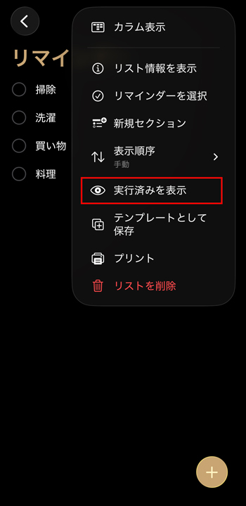 前述した通り、完了にしたリマインダーはマイリストからは消え、実行済みのスマートリストに移動します。でも、マイリストで完了のタスクを確認したいときもあると思います。そんなときは、マイリストの右上にある「…」アイコンをタップし、「実行済みを表示」をタップします。