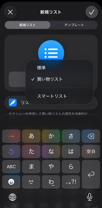 リストを作成する際、リストタイプで「買い物リスト」を選択します。