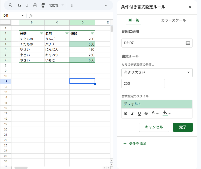 - 条件(数値・文字・日付など)と表示形式(色など)を設定