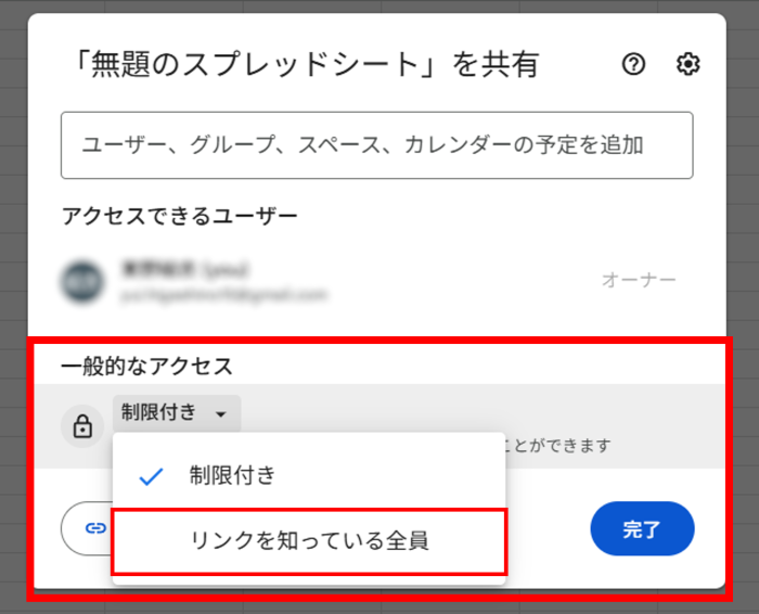 - 「一般的なアクセス」を「制限付き」から「リンクを知っている全員」に変更