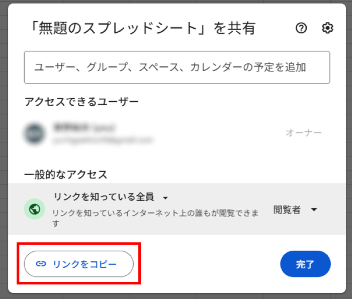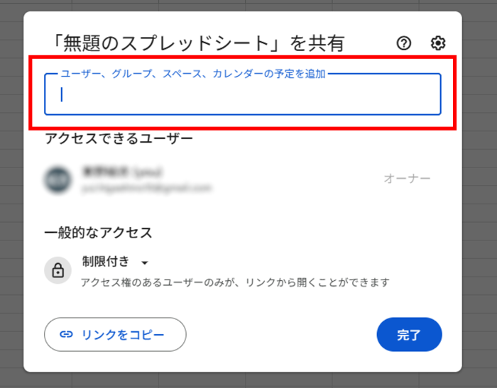 - 共有したいスプレッドシートを開き、画面右上の「共有」をクリック(ドキュメント名が「無題のスプレッドシート」だと変更を促されるので、適宜変更)