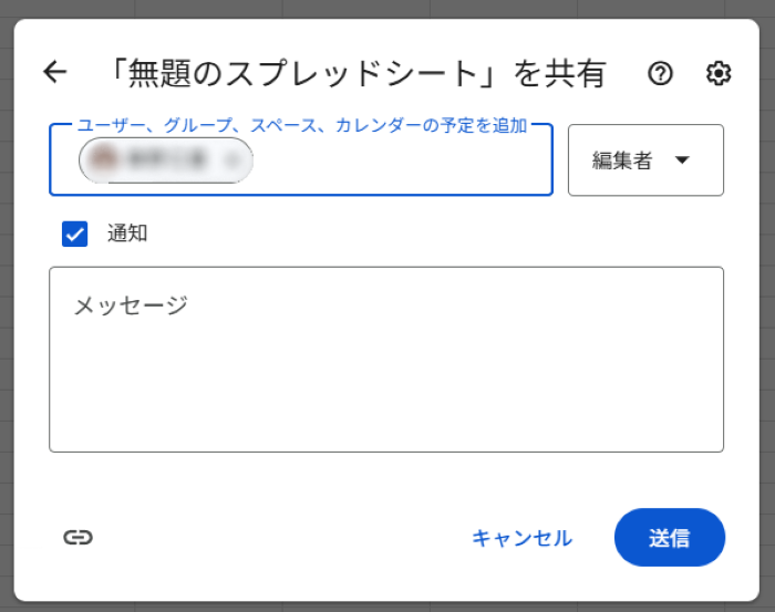- 「ユーザー、グループ、スペース、カレンダーの予定追加」の部分に送信相手のメールアドレスを入力