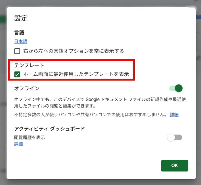 テンプレートギャラリーを消してすっきりさせたいという方は、設定からいつでも変更可能です。画面左上のメニューアイコンから設定を開き、「ホーム画面に最近使用したテンプレートを表示」のチェックを外しましょう。