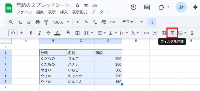 - フィルタをかけたいデータ範囲を選択(関連するデータはすべて含める)