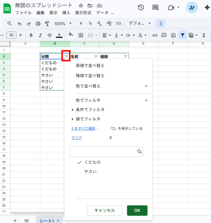 - 各列に表示されるアイコンをクリックし条件を設定し、「OK」をクリック