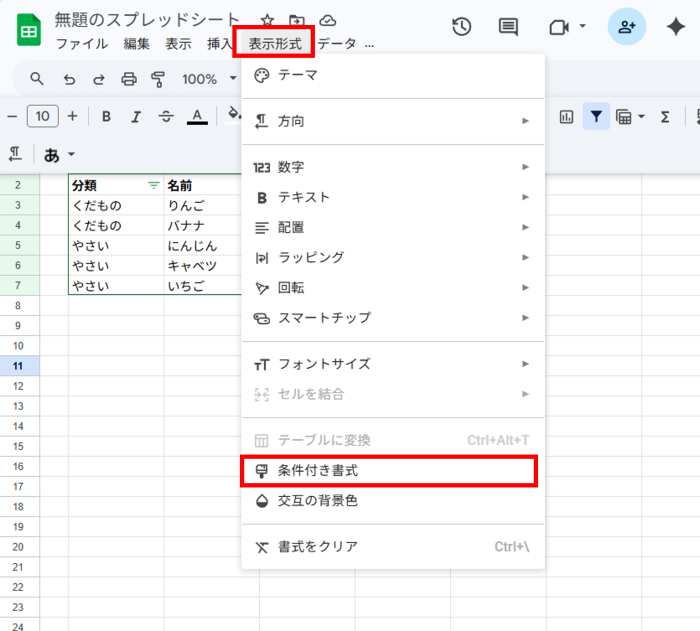 - ツールバーの「表示形式」から「条件付き書式」を選択