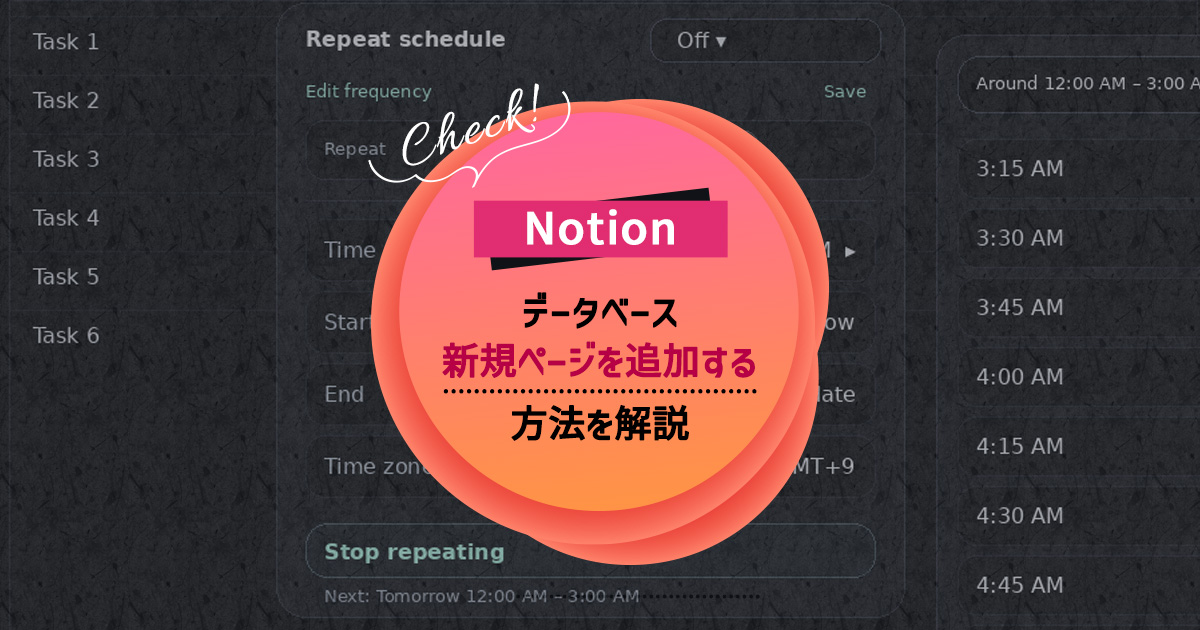 自動追加の用途としては、日記やジャーナリングのような日々の記録を毎日データベースに追加する場合や、毎週月曜に行われる定例ミーティングの議事録データベース、月に一回の支払い日にタスクとして起票する、などが挙げられます。
